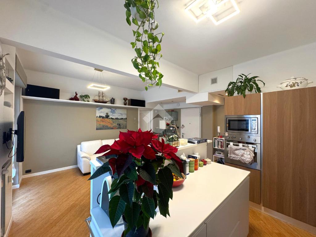 L'immobile, posto ad un piano alto, offre una vista aperta che regala luminosità e un'atmosfera ariosa. Completamente ristrutturato, la casa presenta un moderno open-space che unisce soggiorno e cucina, creando un ambiente accogliente. Le due camere da letto sono spaziose e ben illuminate, mentre il bagno è stato rinnovato con finiture moderne, presente anche una dispensa funzionale. Un balcone offre uno spazio esterno privato per momenti di relax.